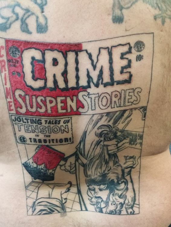 Got a chance to meet up with the rest of the guys working on the WECA Price Guide and we were able to hash out a few things face to face. What does everybody think an 8.0 Triumph No. 1 or Better No. 1 is worth? However, the highlight of the afternoon was Tony Andrews showing us his latest tattoo. Besides collecting Canadian war time comics, Tony is a huge EC collector and is working on completing the entire EC run—including all the Canadian issues as well! He had this little cute tattoo on his back and here it is: