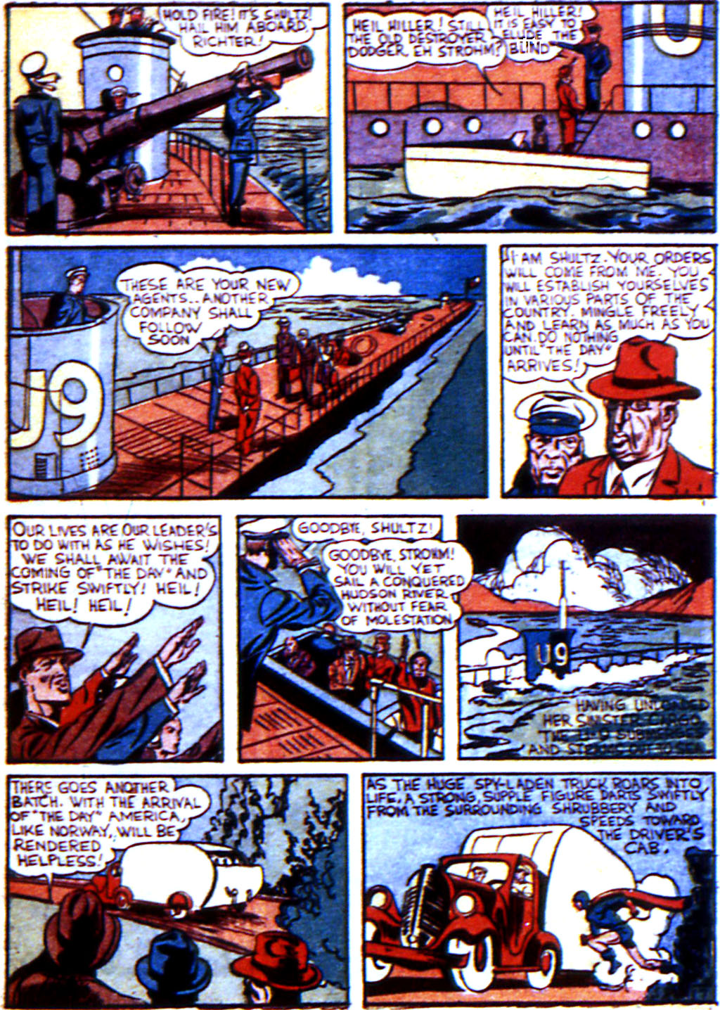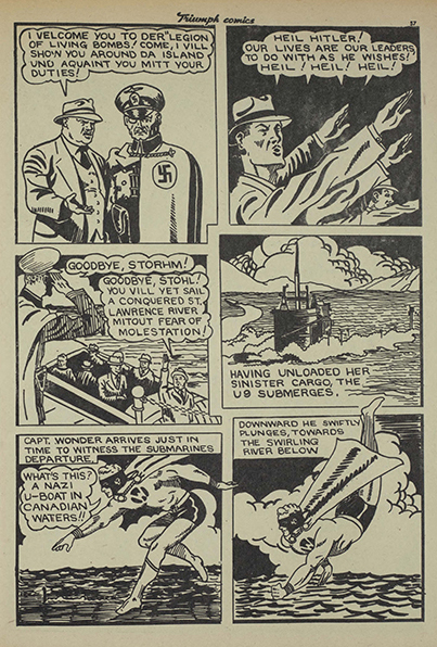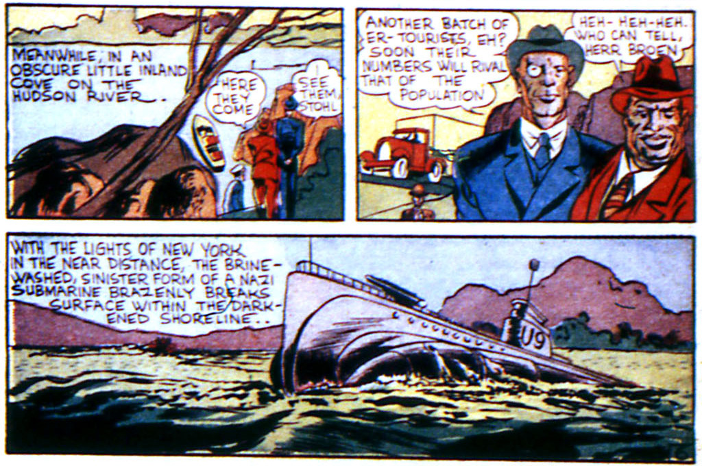 One thing that you might notice is that in the Marvel Boy story when they get on the U-Boat the writer chose to say, “Heil Hiller” while Saakel explicitly chose to say, “Heil Hitler.” I wonder if the American panel was simply a typo or if the writer was simply avoiding any controversy because the Americans were not yet in the war.
