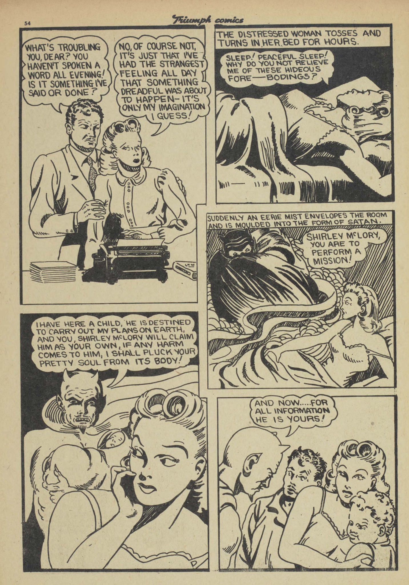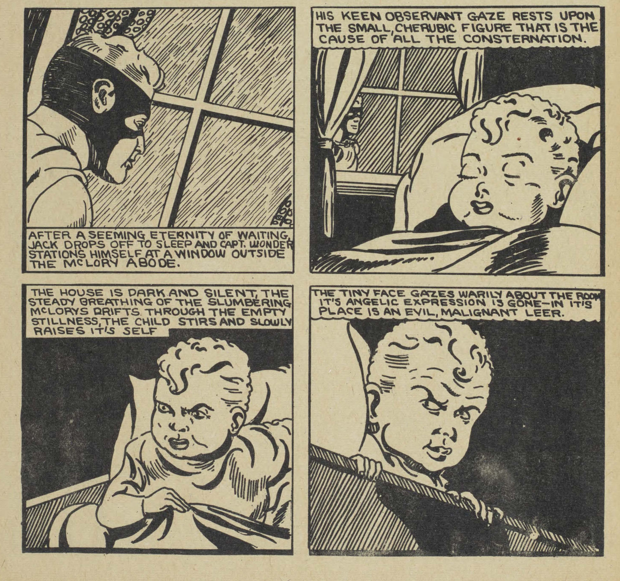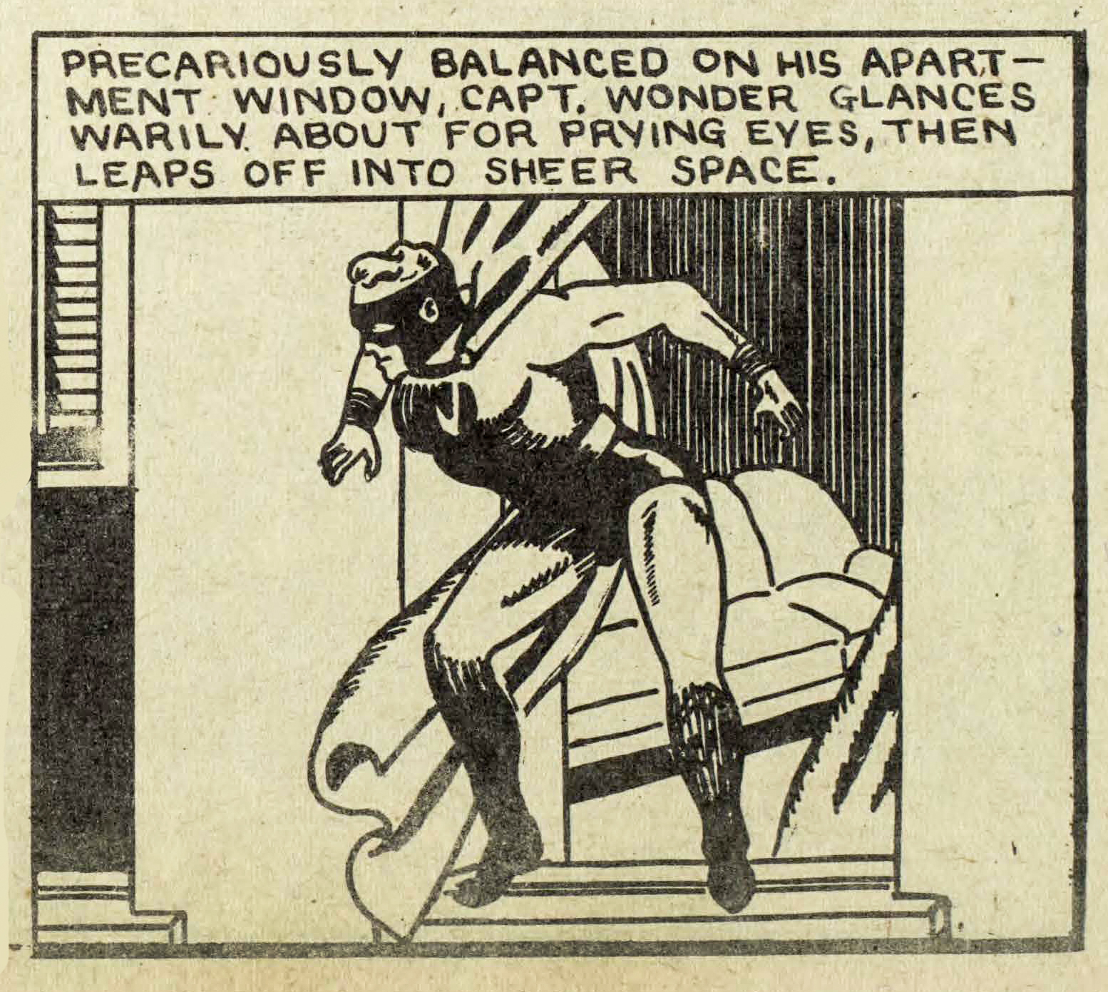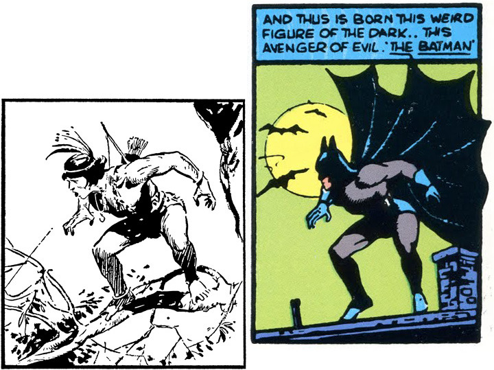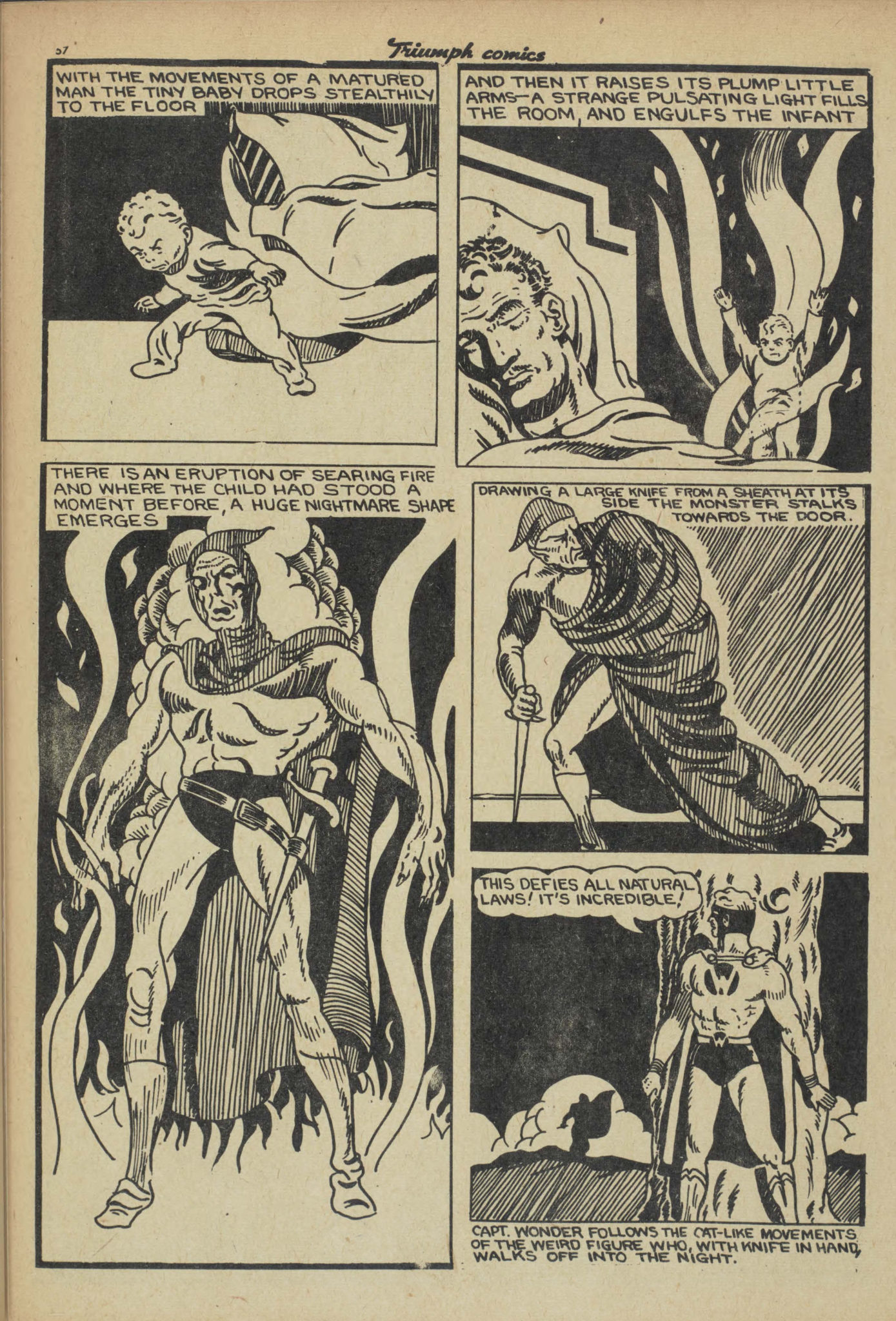 There is also the last panel on page 2 of the Triumph 8 Captain Wonder story which is a direct swipe from the iconic Bob Kane panel from Detective Comics No. 33, which itself is a swipe from a Hal Foster panel that appears in the Tarzan collection compiled in Large Feature Comic No. 5. The wheel goes round and round.