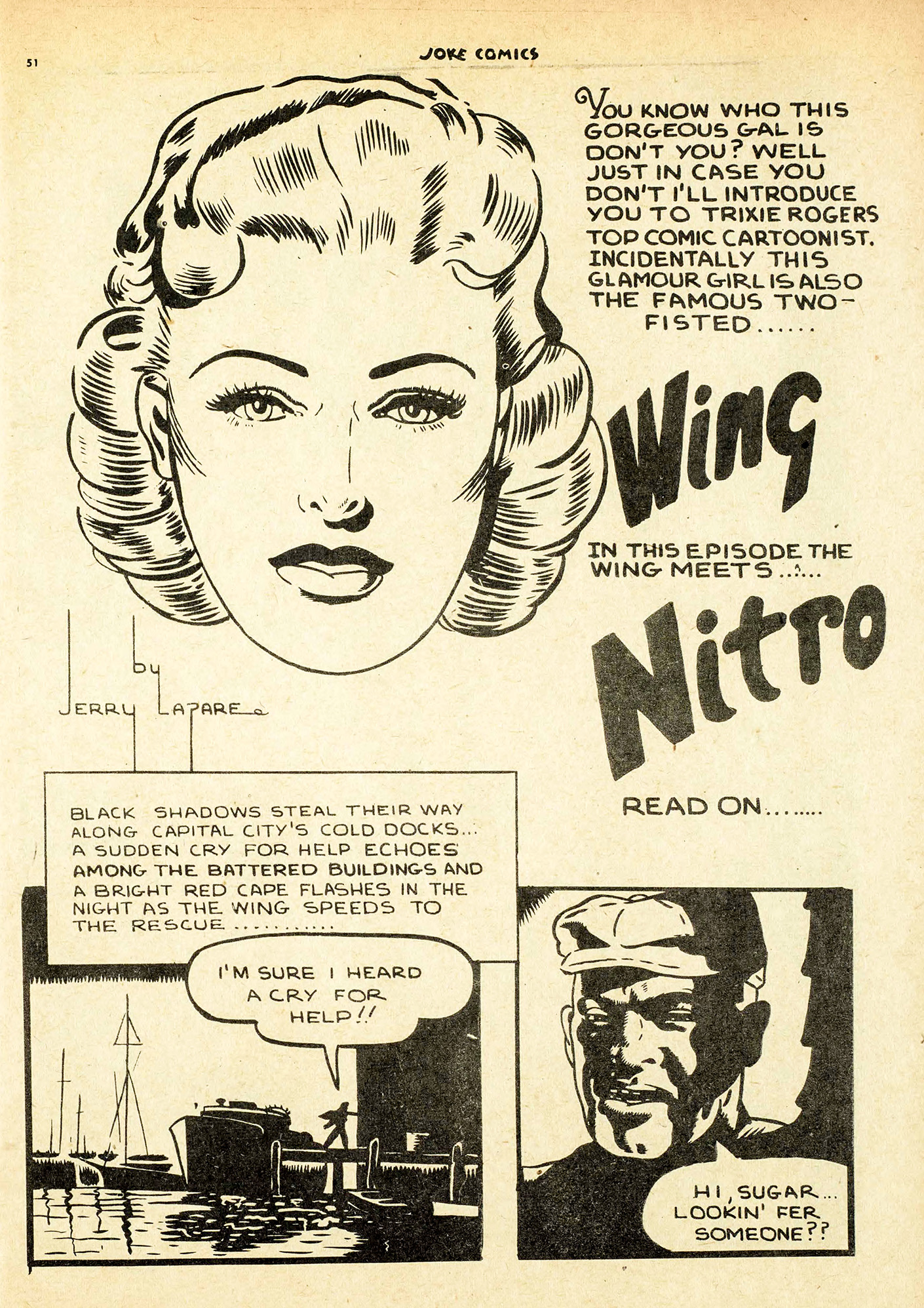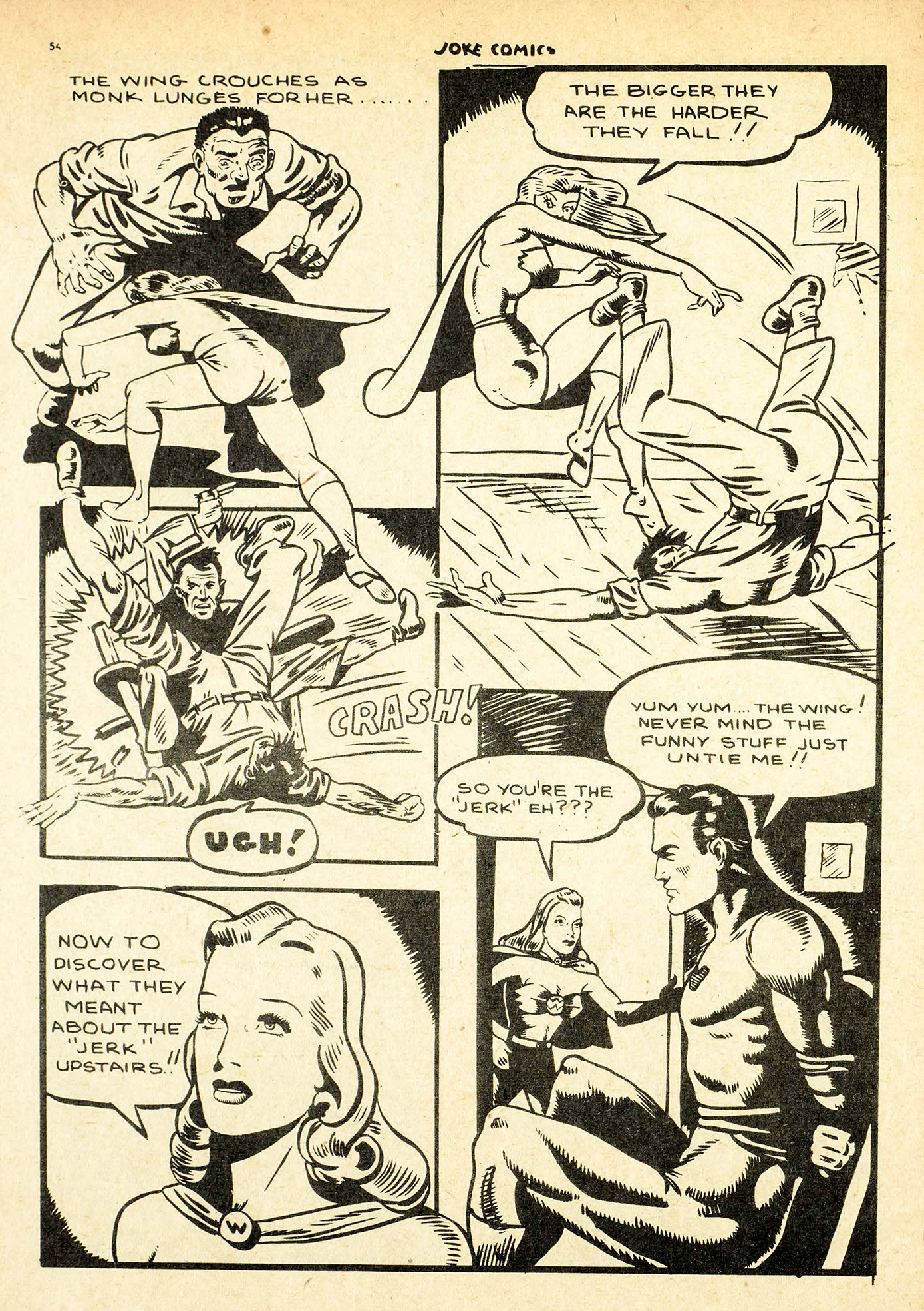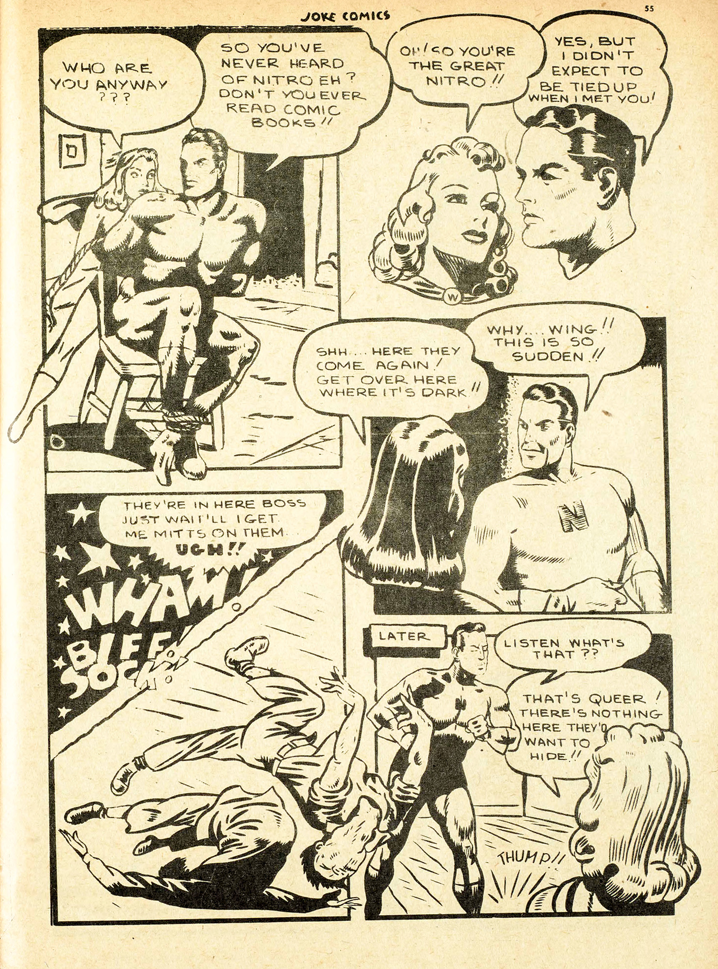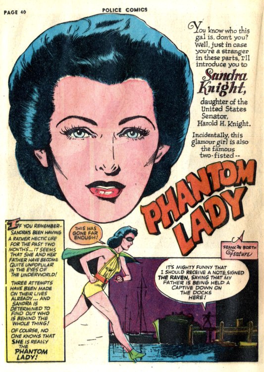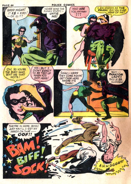 Now Saakel isn’t the only swiper on this scale. Gerry Lazare had his moments as well. Here are a few pages from his “The Wing Meets Nitro” story in Joke comics No. 17 followed by corresponding pages from the “Phantom Lady” story from Police Comics No. 20.