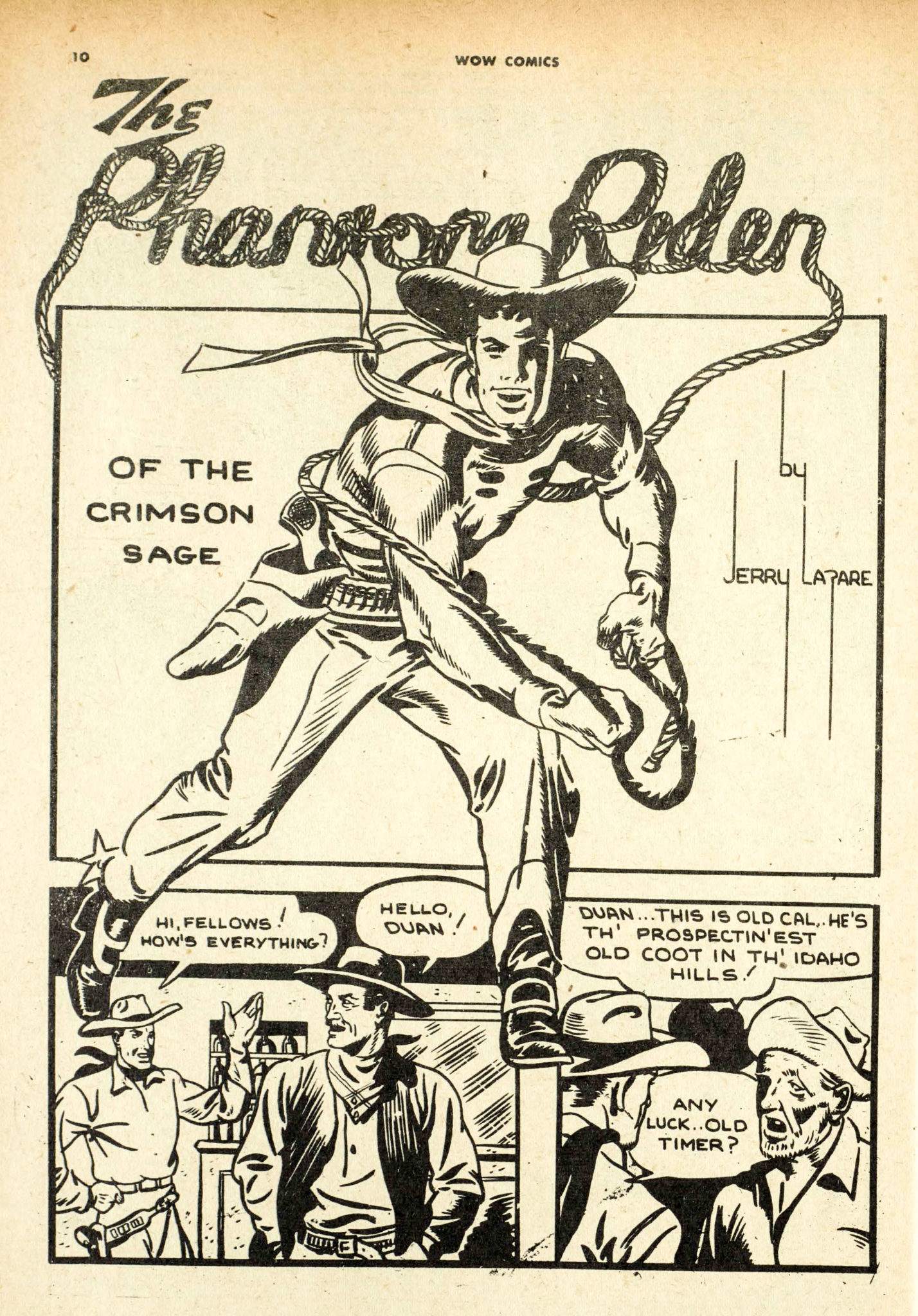 Also, take a look at Gerry’s splash panel for his “Phantom Rider” story from Wow Comics No. 24 along with Adrian Dingle’s take (probably an unknowing swipe) from the cover of Wow 24 finally followed by Mort Meskin’s original source for these, the cover for Leading Comics No. 5 featuring Vigilante (Thanks to Art Cooper for picking this one out):