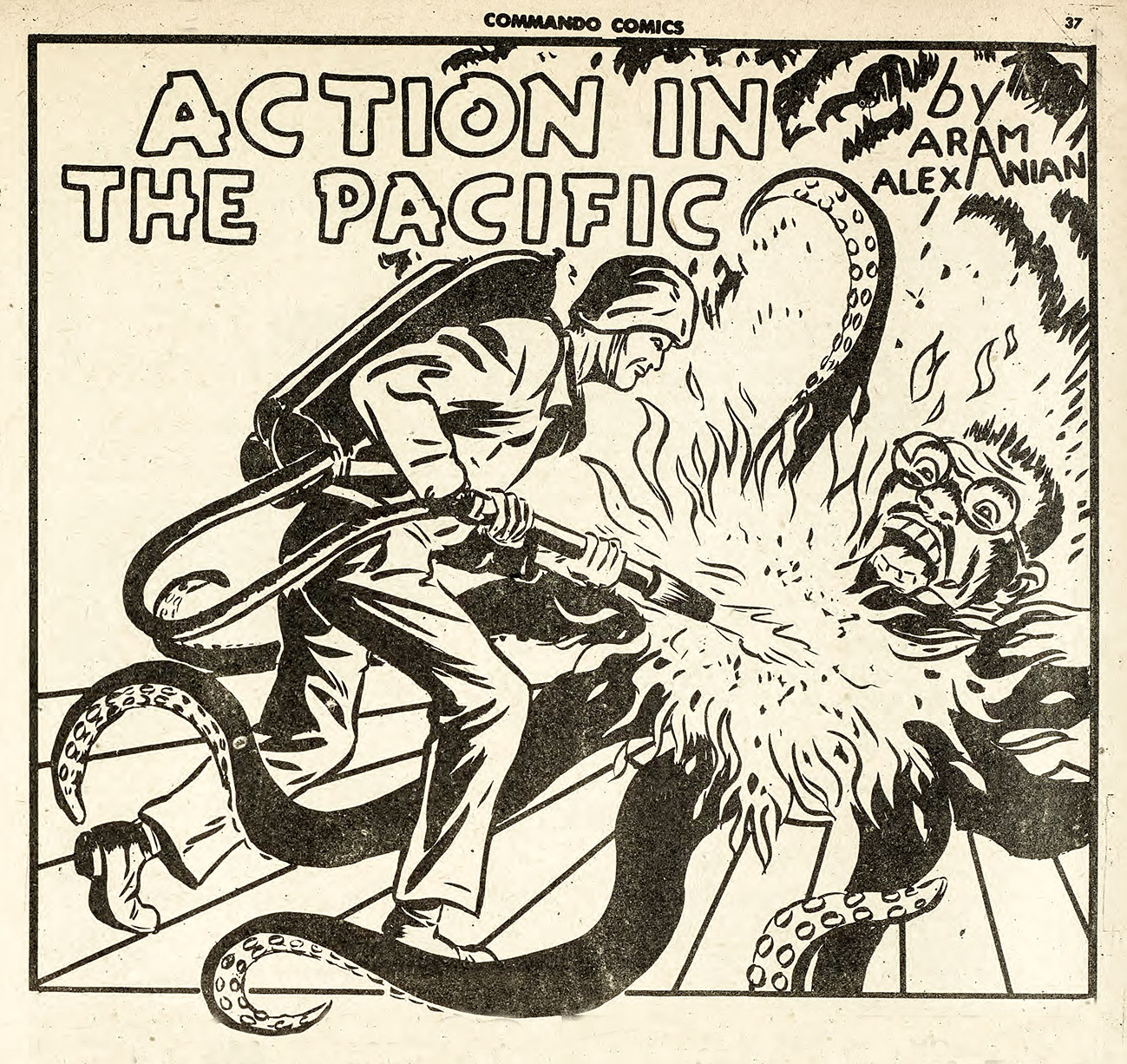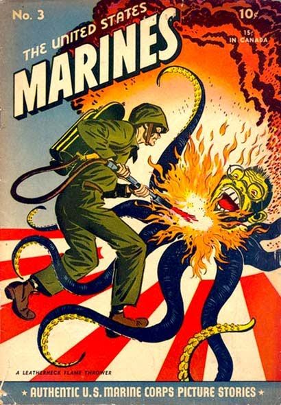 The next one is Alexanian’s splash panel for his “Action in the Pacific” strip from Commando Comics No. 14. This is the well-known fried Tojo calamari panel but it may be even more well known as the illustration on the cover of U.S. Marines Comics No. 3 (thanks to Stephen Lipson for pointing this swipe out). Both illustrations follow: