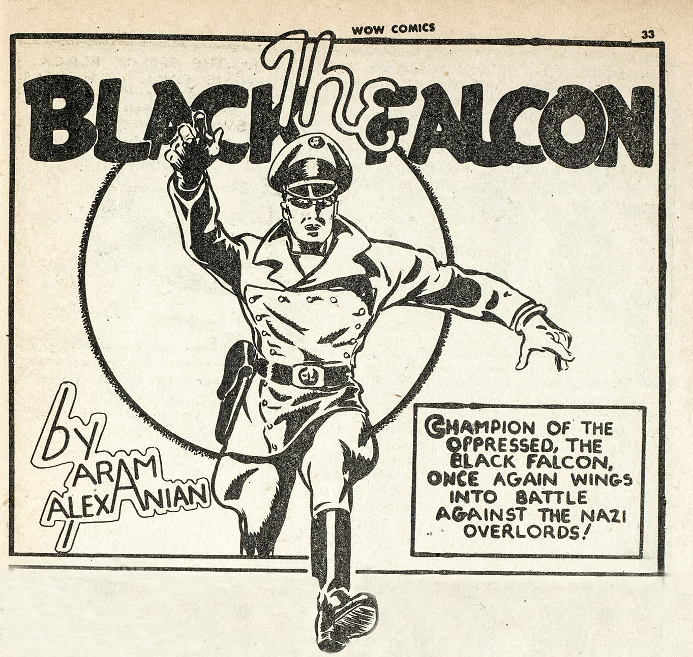 The last set of WECA swipes are owned by Aram Alexanian. The first is really a whole character swipe but the panel I want to show is the splash panel from the “Black Falcon” story that appeared in the same issue that Gerry Lazare’s Alex Raymond Jungle Jim swipe appeared, Wow Comics No. 25. First is Alexanian’s splash followed by Reed Crandall’s cover for Military Comics No. 13: