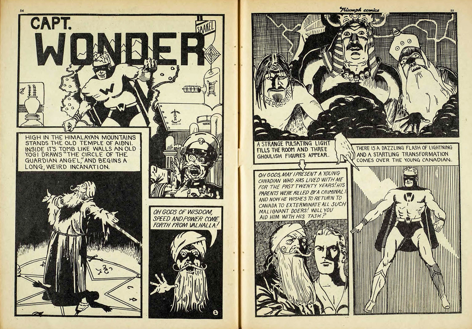 Now Captain Wonder was Bell Features thinly veiled answer to Fawcett Publications Captain Marvel. Saakel was probably asked to contribute one costumed hero to the Bell Constellation probably by Cy Bell himself. You can easily see the origin similarities in these first two pages from the first Captain Wonder story in Triumph Comics No. 7: