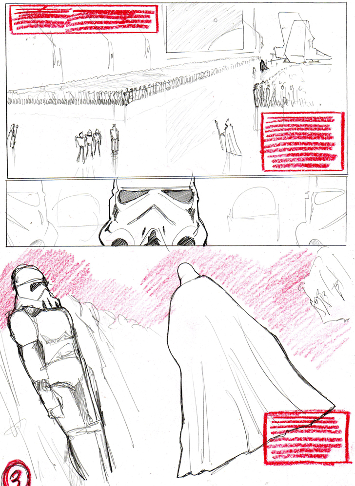 This next instalment (of an on-going post) about building a story is at the forefront of my excitement in comics today and I’m bursting to share it. I also realise that Star Wars Comics may have a certain ‘reputation’ (correct me if I’m wrong) and may not be considered as legitimately cool right now as other, second tier books might be?!. I’d like to at least try (if I may be so bold) to change all that, if it’s even true at all?! I previously proposed a punchy, prelude to a Storm Trooper story that’s changed slightly and now looks as follows:- It’s an 8 page story/suggestion idea set between Star Wars episode 3 and 4… which stemmed from the news in last week’s Radio Podcast about a new Star Wars TV series set in that same time which is currently in development – a Star Wars shaped blank canvas almost.
