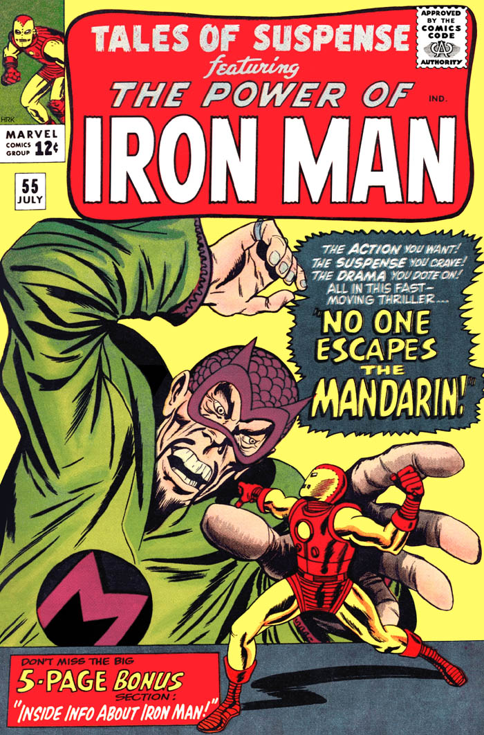 My favourite cover of the run with an oversized image of the Mandarin ready to crush a diminutive Iron Man. We left Iron Man trussed up like a turkey last issue in metal coils at the mercy of the Mandarin. Iron Man tricks the Mandarin into looking for Tony Stark, breaks free, saves a missile and locates and destroys the Mandarin interceptor ray. All he has to now is beat a very angry Mandarin and get away. Which he eventually does with some difficulty. Its clear by the end of this book the Mandarin is on his way to be Iron Man’s big bad. The Mandarins next appearance is in issues 61 and 62 of Tales of Suspense and features his origin and the 10 Makluan power rings.
