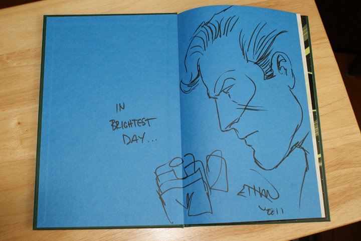 I walked around artist alley (with photographer Ryan Parent), looking at the different prints that were available for sale. There were prints available for any price range. There were some beautiful 8-1/2″ x 11″ for only $5, a great deal. We waited in line for Ethan Van Sciver to sign Ryan’s copy of Green Lantern: Rebirth. Ethan signed the book and did a great head shot of Hal Jordan, for free. That’s right, he would sign your book for free. I heard other people had the same experience (so when you get a signature, try to get the hardcover version signed, the artist will put extra effort into it).