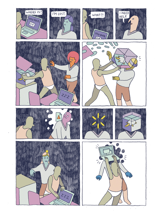 Some pages have real tales to tell with a beginning and an end and dialog in between. Others are funny moments or reflections or just weird sequences of panels or even just single-page illustrations. Still others are complete psychedelic fever dreams that left me scratching my head and flipping back to start them over in hopes of figuring out what the heck just happened.